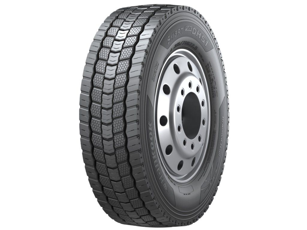 Hankook Smart Flex DH51Pozícia: Záberová.Prevádzka: regionálnaPneumatika Hankook Smart Flex DH51 je navrhnutá pre hnacie nápravy nákladných vozidiel a poskytuje špičkový výkon vo všetkých podmienkach regionálnej dopravy po celú dobu svojej životnosti.Vďaka inovatívnym technológiám a vylepšenej konštrukcii ponúka vynikajúcu konštrukciu; vyšší kilometrový výkon a optimalizovanú spotrebu paliva po celú dobu svojej životnosti. Najdôležitejšie vlastnosti a charakteristiky: - M+S 3PMSF. - Širšie bloky behúňa – zväčšujú styčnú plochu pneumatiky s vozovkou; čím zlepšujú priľnavosť; predlžujú kilometrový výkon a znižujú valivý odpor. - 3D lamely – poskytujú vynikajúcu trakciu; znižujú nepravidelné opotrebenie a zvyšujú palivovú účinnosť. - V-široké samoregeneračné lamely – zlepšujú priľnavosť a obnovujú svoj tvar s opotrebovaním pneumatiky; čo zaisťuje konzistenčný výkon. - Skryté drážky – postupne sa objavujú s opotrebovaním pneumatiky a vytvárajú nové kanály pre efektívny odvod vody; čím zlepšujú bezpečnosť na mokrej vozovke.- Samoregeneračné lamely v tvare rohu – minimalizujú napätie na ramennej časti pneumatiky; zabraňujú prasklinám a zaisťujú lepší odvod vody.Dodatočné parametre